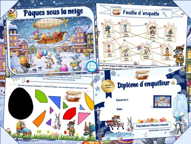 Pour prolonger l’ambiance de l’enquête, découvrez aussi le kit goûter Pâques sous la neige, un fichier PDF à imprimer avec invitations, décorations de table, étiquettes, boîtes cadeaux et accessoires photo assortis.