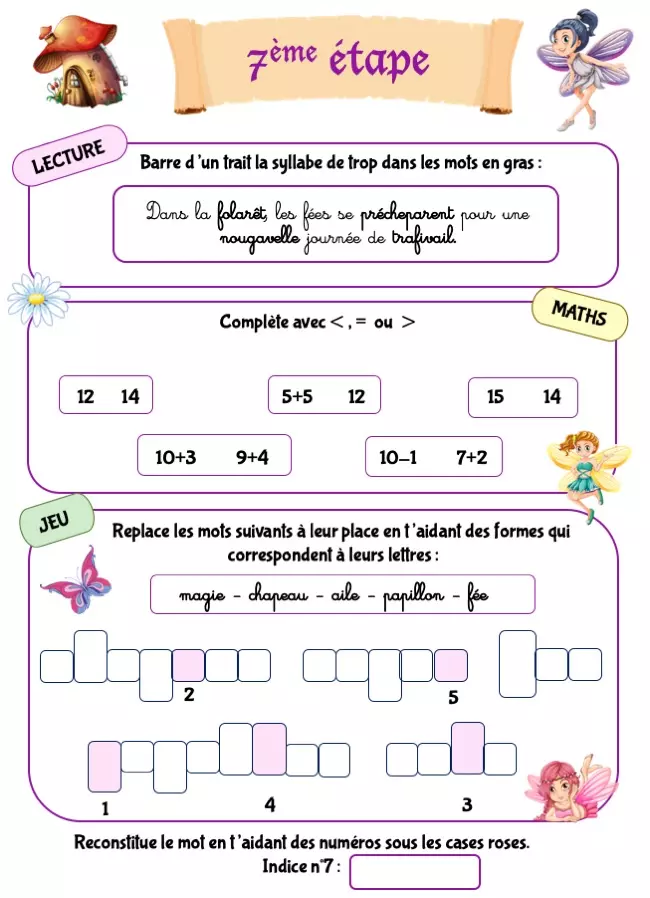 Ce cahier d’activités CP sur le thème des fées propose bien plus que de simples jeux à imprimer : il transforme les révisions du début de cycle 2 en une aventure captivante. À travers 10 étapes progressives, votre enfant renforce ses acquis en français et en mathématiques tout en prenant plaisir à résoudre des énigmes.