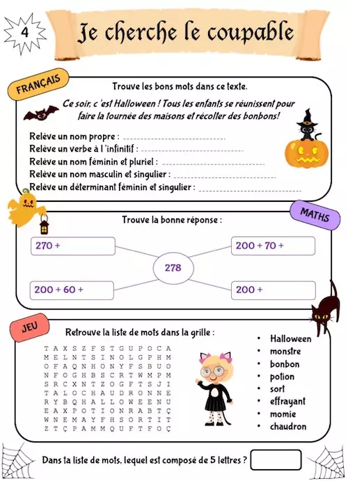 - 10 pages d’exercices en mathématiques et français sur le thème d’Halloween.