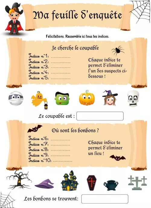 - Thème : Enquête d’Halloween (Qui a volé les bonbons ?)