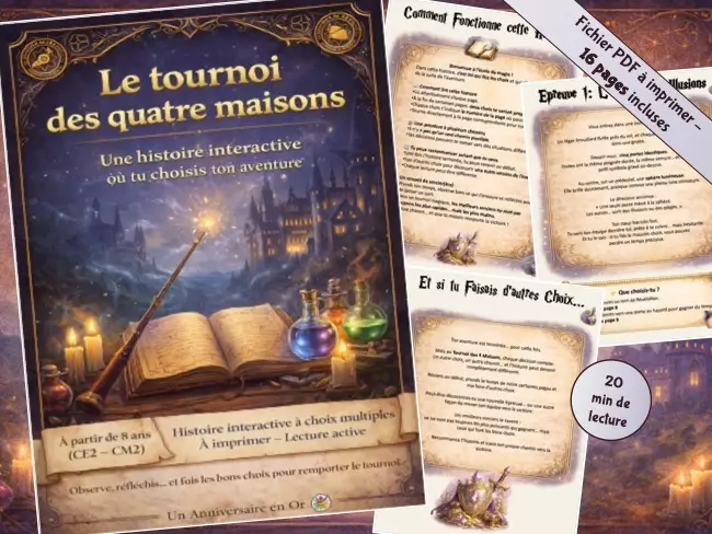 Invitez votre enfant à vivre une aventure palpitante où chaque choix peut tout changer avec Le Tournoi des 4 Maisons, une histoire interactive école de magie à imprimer conçue pour les enfants de 8 à 10 ans (CE2 – CM2).