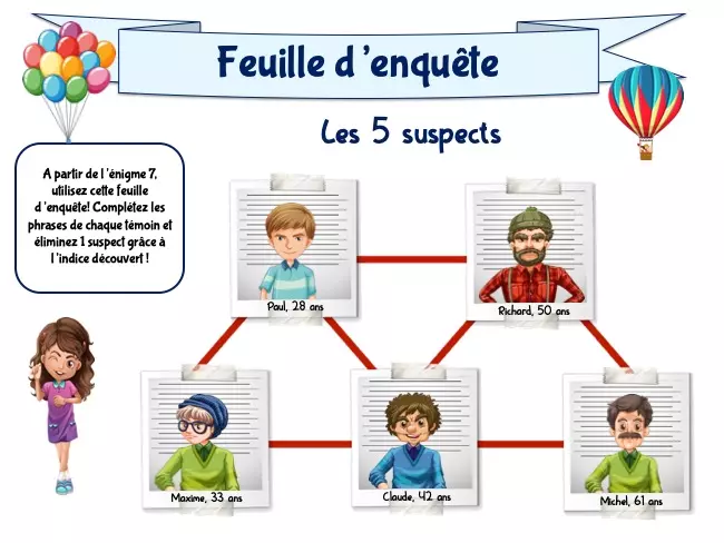 - Une feuille d’enquête : Pour collecter les indices et éliminer les suspects.